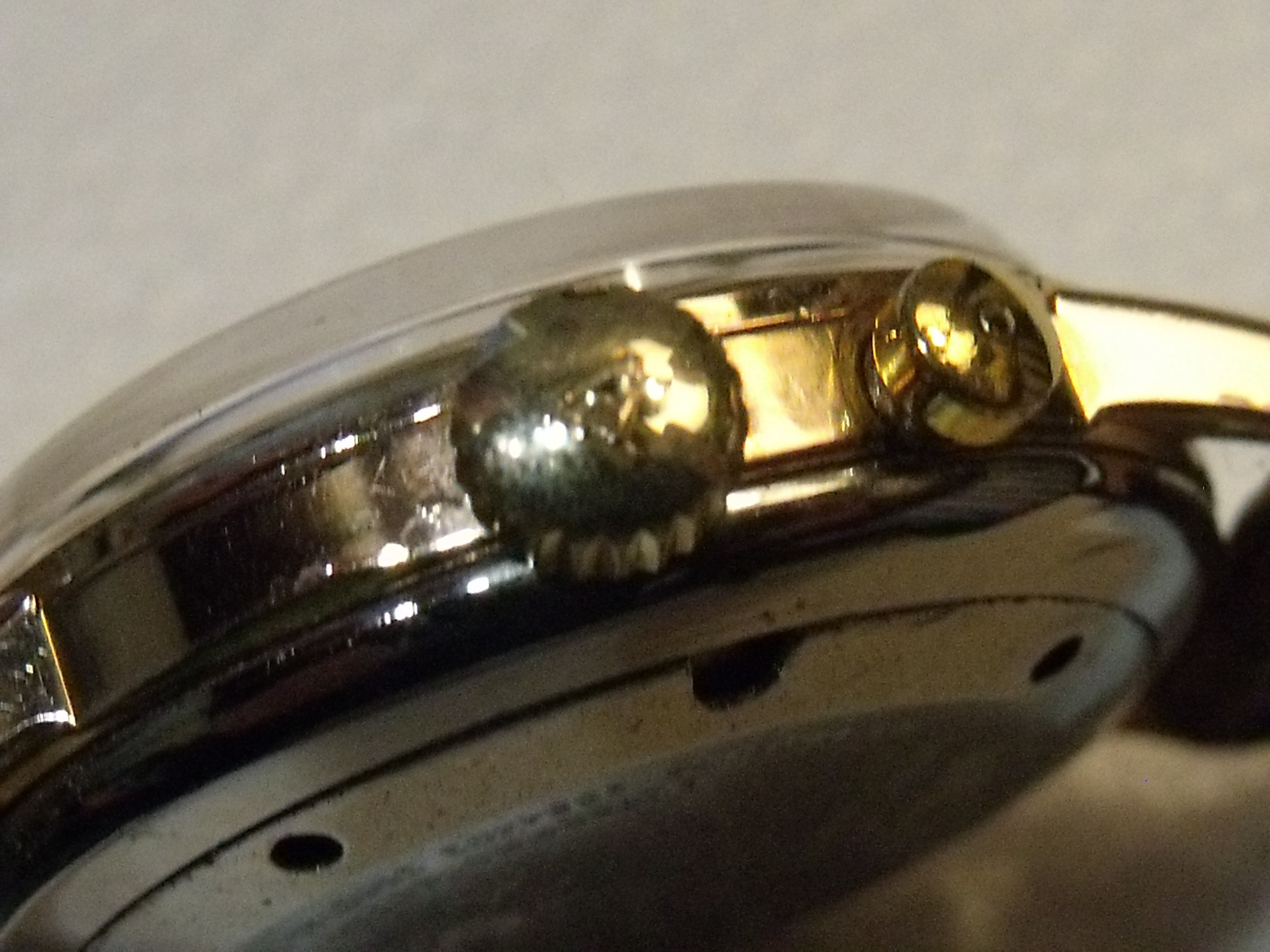 Diamètre de la montre hors remontoir et cornes : 34 mm. Epaisseur : 12 mm Boîtier métal plaqué-or 20 microns, Fond acier Inoxydable N° S 2315 A - Cadran 28 mm satiné à index dorés, et circonférence dorée, protection par verre plexiglas facilement polissable si nécessaire ultérieurement.