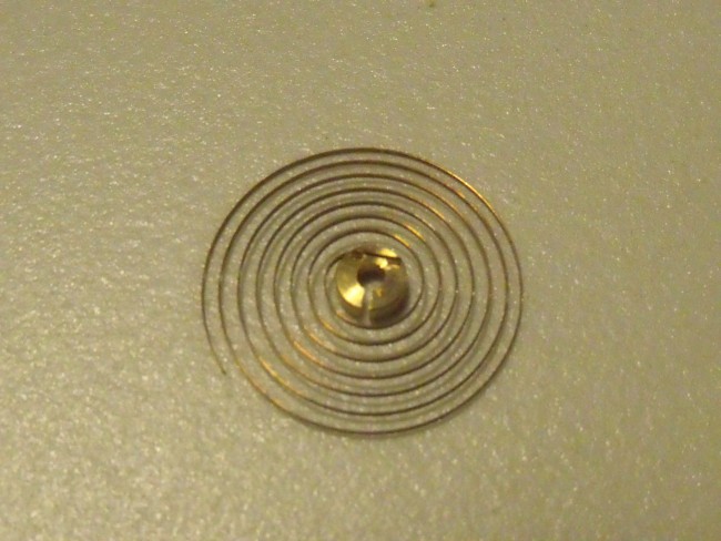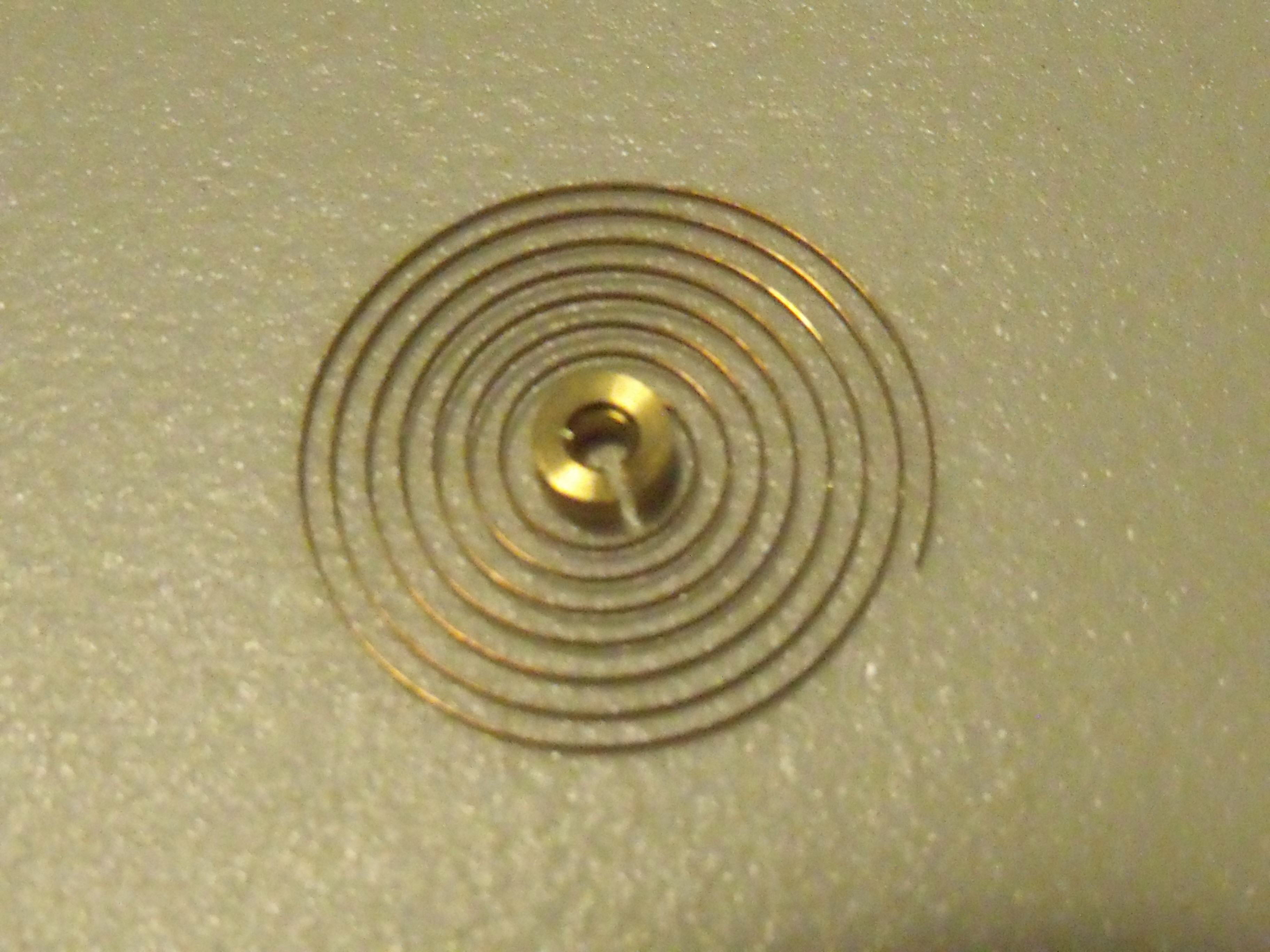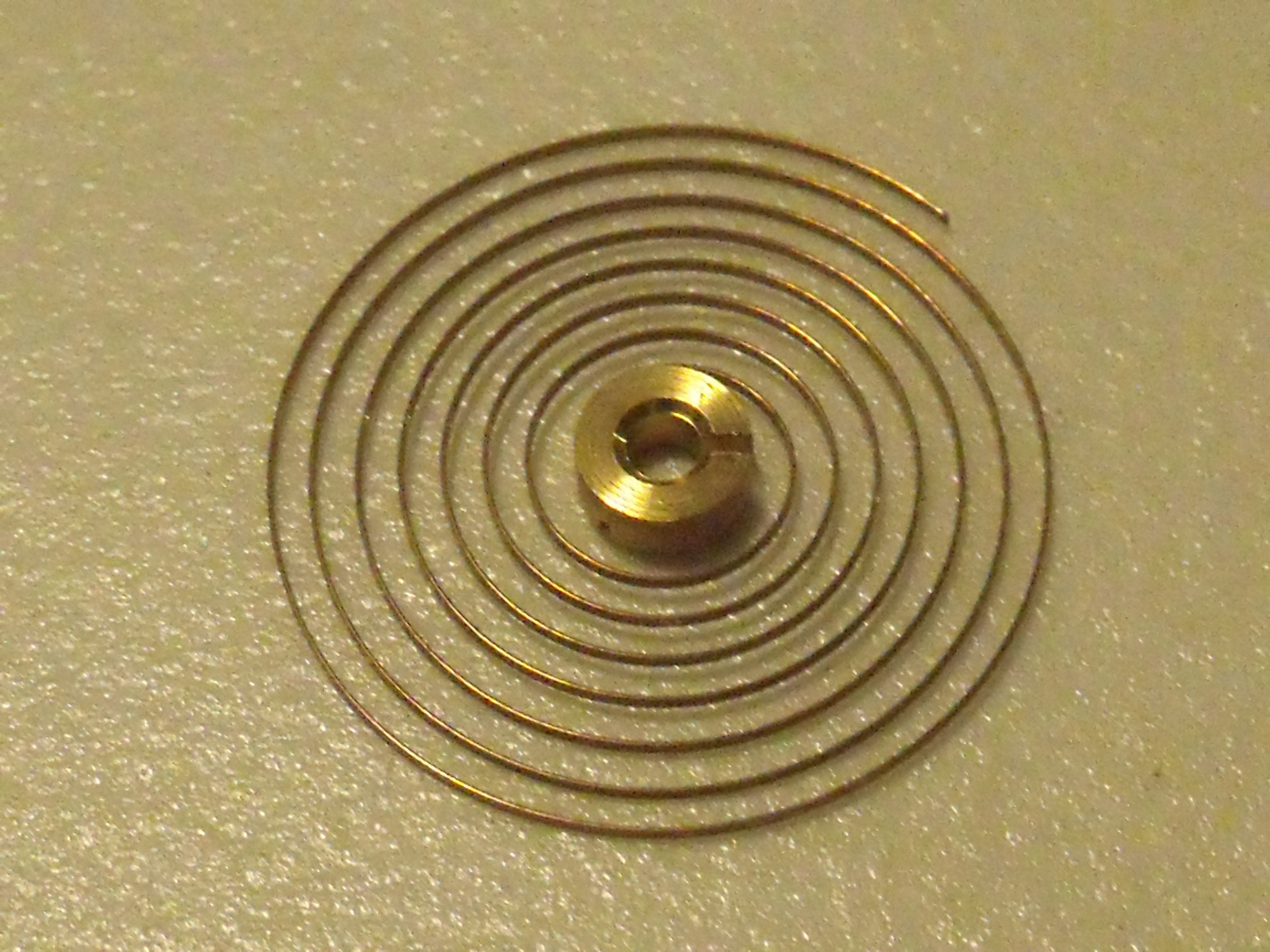 Spiral plat dextre pour réveil mécanique à ajuster, diamètre 19,5 mm, hauteur 0,50 mm, diamètre du trou central de la virole 1,70 mm, laiton.